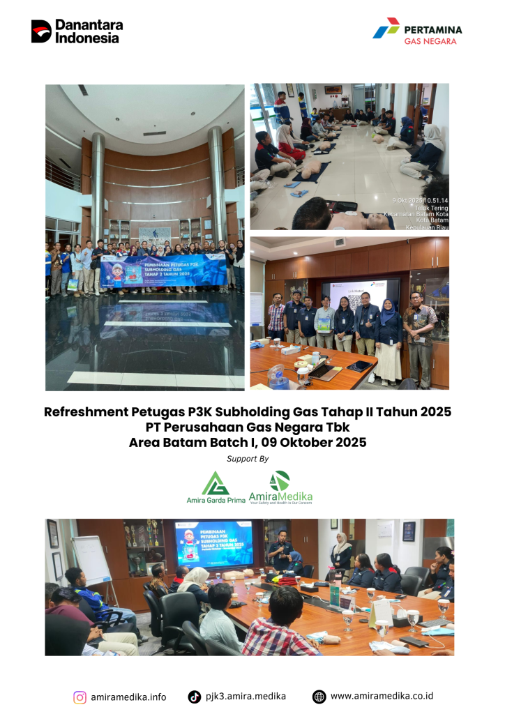 Dalam upaya memperkuat budaya keselamatan dan  kesehatan kerja (K3), PT Perusahaan Gas Negara (PGN) kembali mengadakan kegiatan Refreshment  bagi petugas Pertolongan Pertama pada Kecelakaan (P3K) Area Batam batch I pada tanggal 09 Oktober 2025